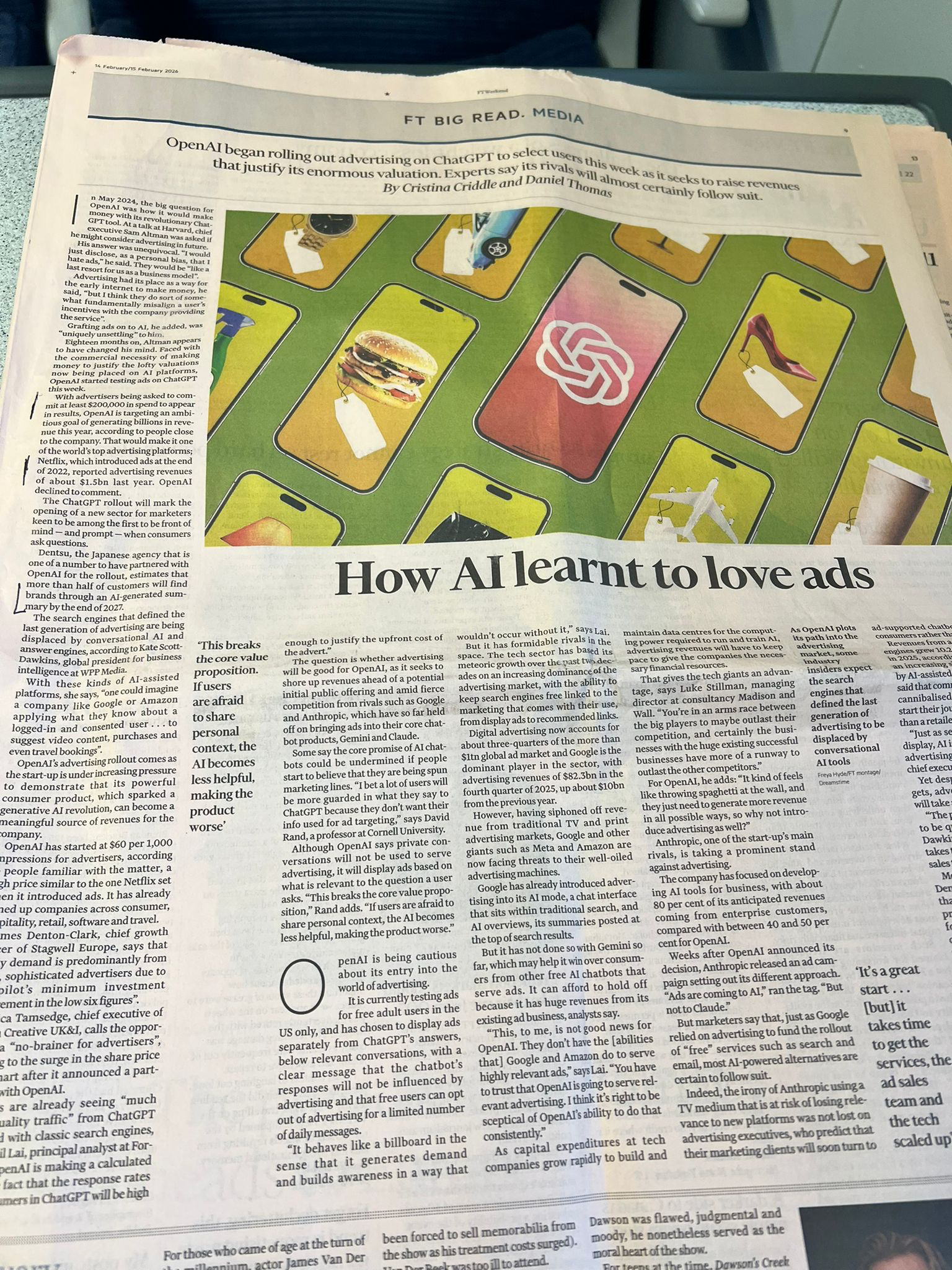 "If you want to get ChatGPT to a billion people (and beyond) for free you need to introduce a product other than subscriptions."
